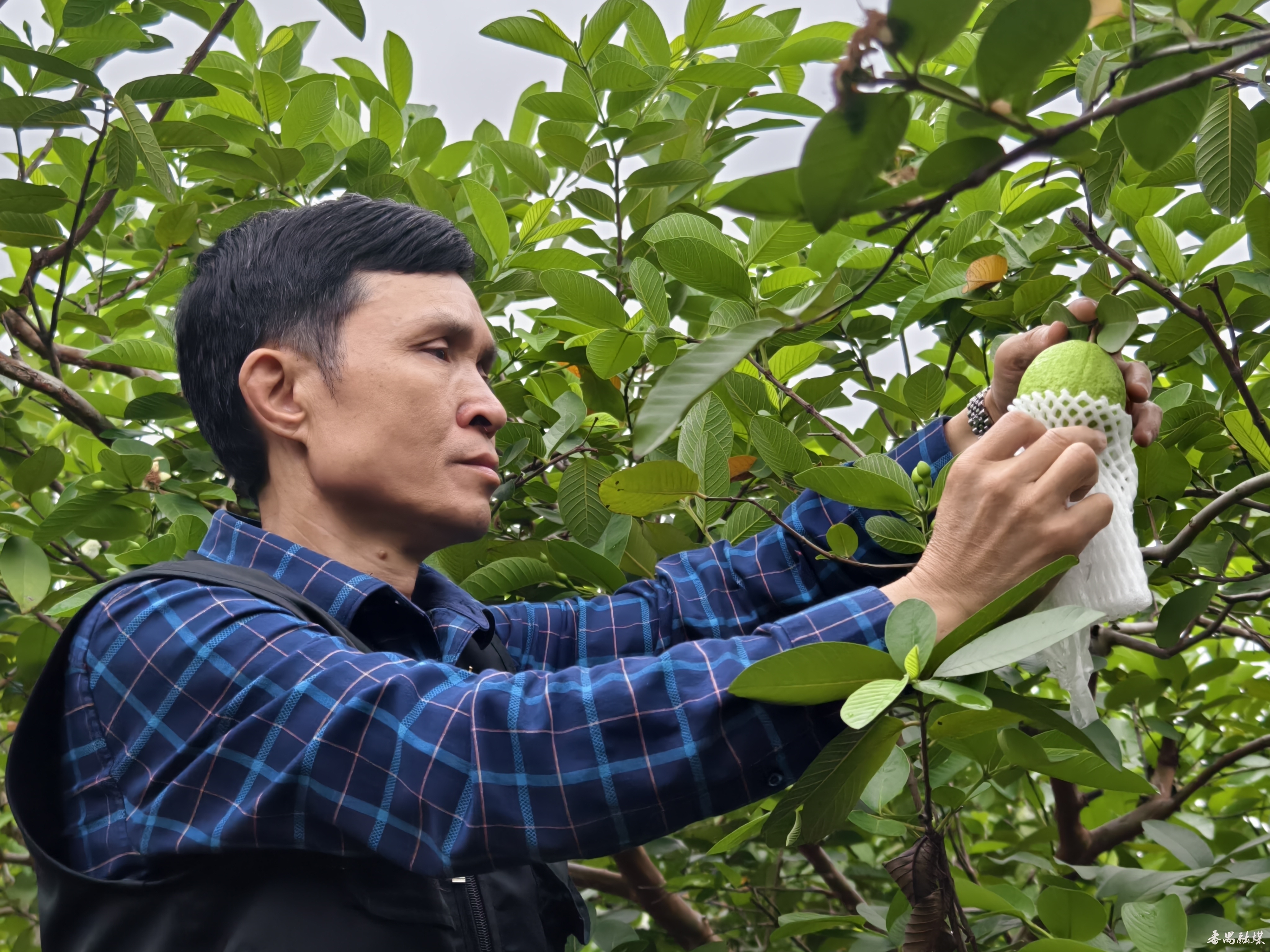 省劳模冯志佳查看胭脂红番石榴生长情况