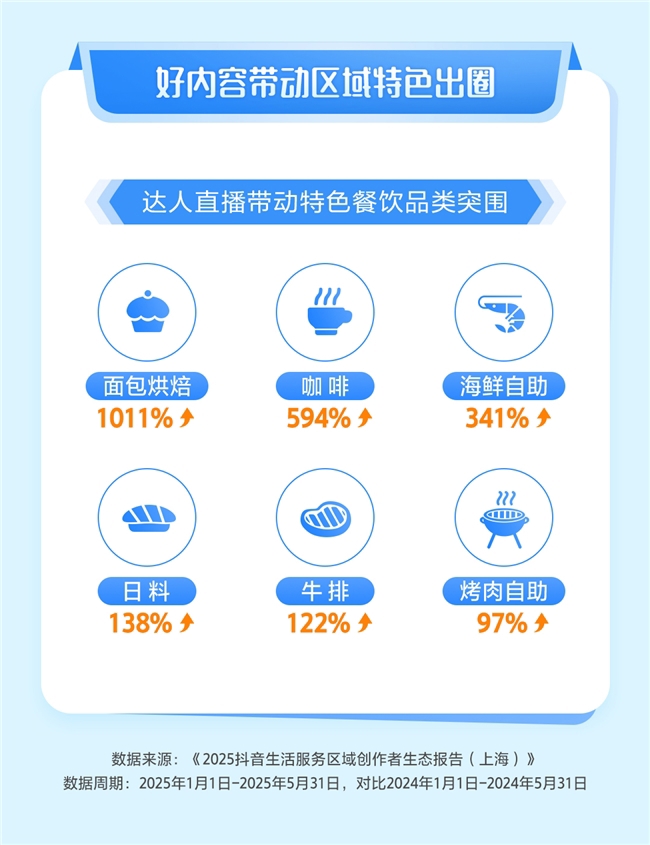 在达人直播的强劲助推下,海派特色餐饮品类迎来爆发式增长。其中,融合海派风情的面包烘焙、彰显城市咖啡文化魅力的精品咖啡和主打高端鲜活体验的海鲜自助,交易额同比增幅尤为亮眼,分别暴涨超10倍、近6倍和3.4倍,生动展现了上海餐饮的创新活力和消费潜力。