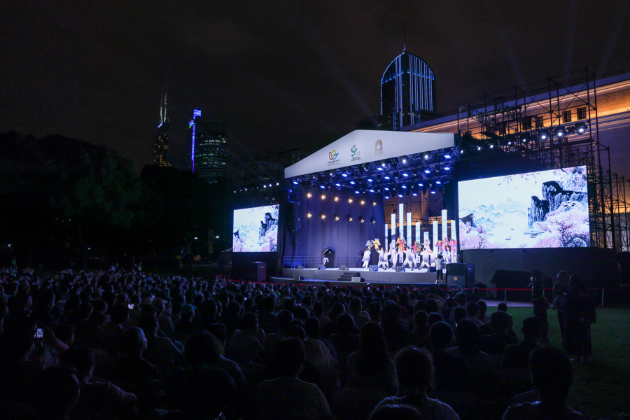 10月16日晚,黄浦区上海城市草坪音乐广场,第二十四届中国上海国际艺术节“艺术天空”板块推出吹来“艺海秦风”奏响三秦古韵新乐章——陕西演艺集团非遗专场演出活动,荟萃了陕西传统音乐、地方戏曲、民间舞蹈等多项非遗精髓。三秦古韵在金秋夜色中流淌,观众随节拍互动,氛围热烈,宣告2025上海城市草坪音乐会“秋之韵”正式拉开帷幕。