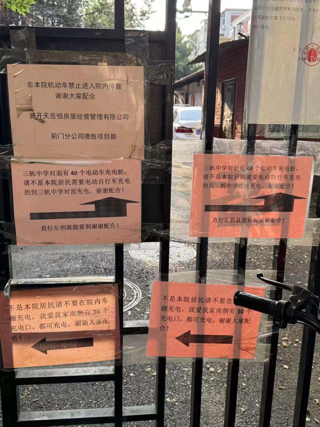 新风街小区的居民陈女士则认为,这条路上安装充电桩是“最优解”。新风街小区建成至今已有40年,分多个院落,其中1号、2号和3号院紧挨学校。记者注意到,三个院落空间狭小,公共空间几乎都用来停放机动车和非机动车,仅2号院有一处充电车棚,里边也停得满满当当。小区各处都张贴着物业的提示,呼吁其他小区的居民不要使用该充电车棚。