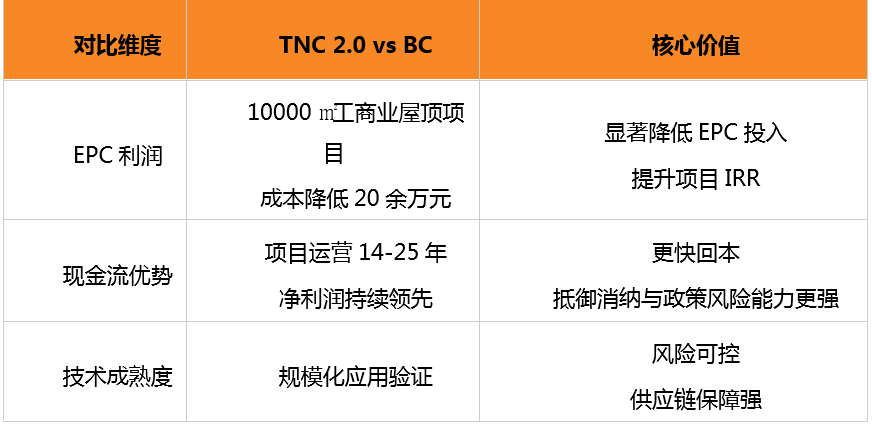 更高EPC利润:在同等项目条件下,每建设10000m²工商业彩钢瓦屋顶项目,TNC 2.0对比同版型BC组件,EPC成本降低20余万元,TNC2.0净利润高于9.4万元以上。